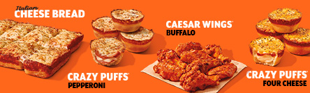A HOT treat ready when you are! Your Crazy Puffs®-N-Stuff Meal Deal Code will be emailed to you and s redeemable for pick up on the Little Caesars app or website for Crazy Puffs® Pepperoni, Crazy Puffs® Four Cheese, an Italian Cheese Bread, and an order of Buffalo Chicken Wings.