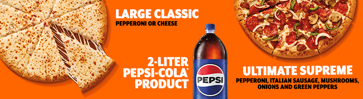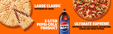 Get HOT pizza ready when you are! Your Supreme Meal Deal Code will be emailed to you and is redeemable for pick up on the Little Caesars app or website for a Large Round Ultimate Supreme Pizza, a Classic Cheese Pizza, and a cold 2 Liter.